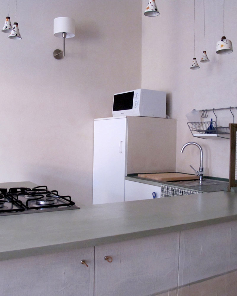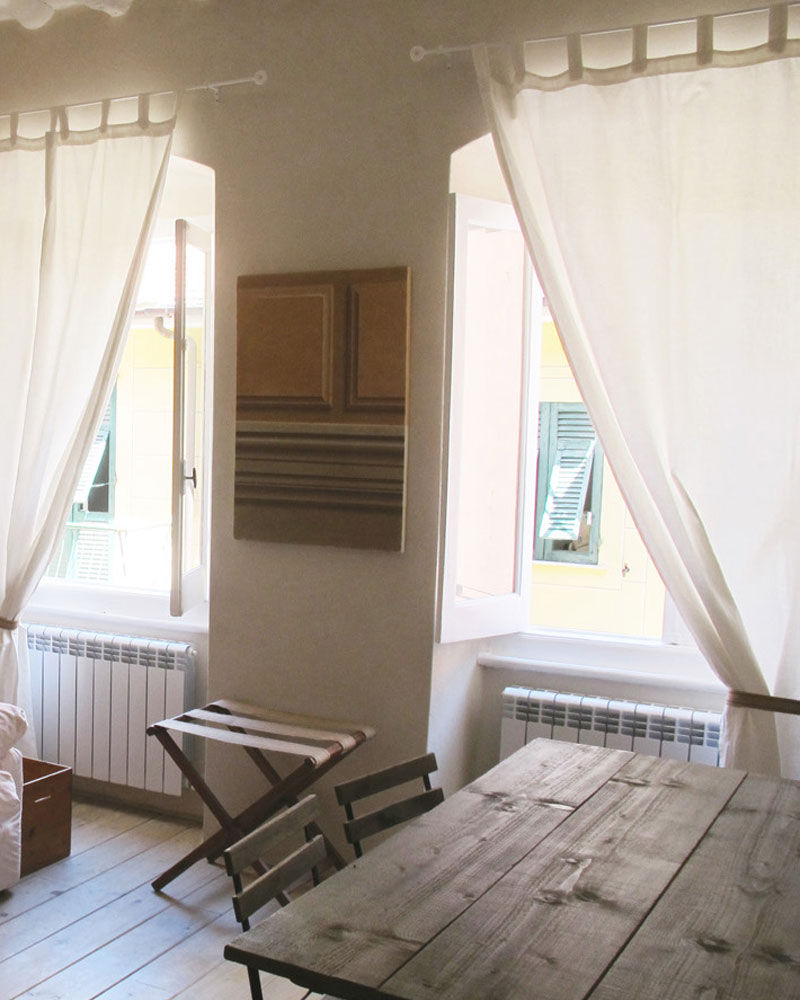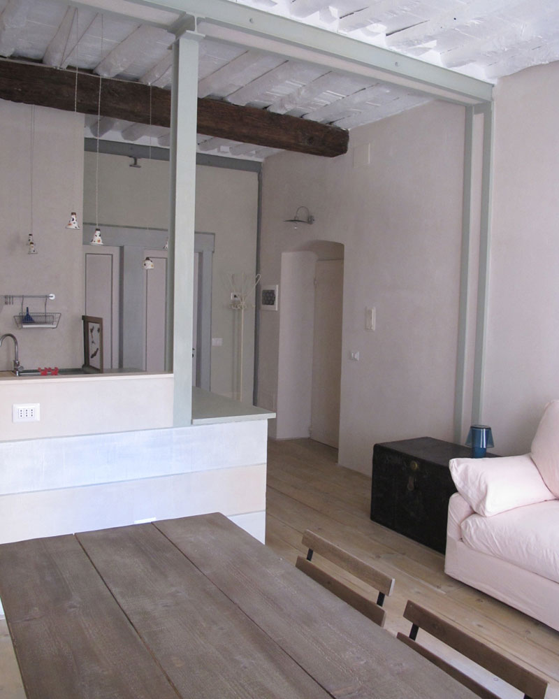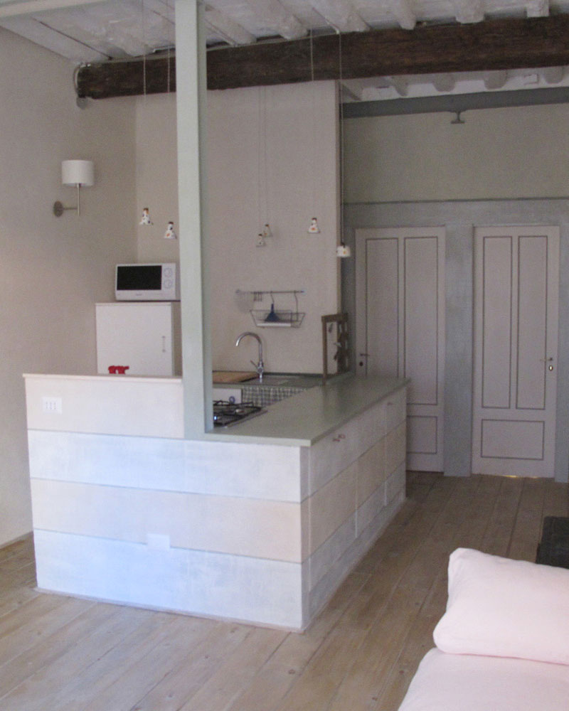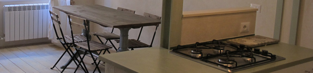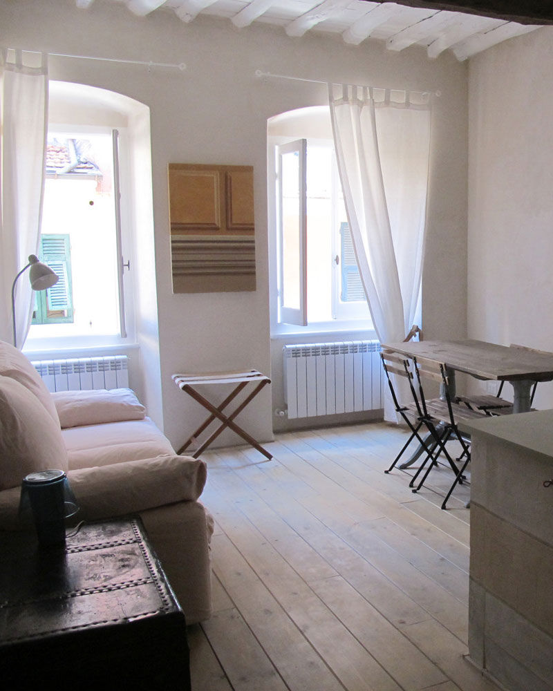 The Living area has windows which open out over a little Square, the Seating area has a comfortable sleeping Sofa and a Dining table for 6 persons. The Kitchen is open on the living/dining area